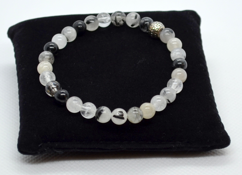 Comme son nom l’indique, le quartz tourmaline est un quartz avec des inclusions de tourmaline, ce qui lui donne son aspect noir et blanc. En lithothérapie*, le quartz tourmaline symbolise l’union des contraires et l’équilibre. Il aiderait à régler les conflits intérieurs et à avoir confiance en soi. Le quartz tourmaline est associé au chakra racine et, bien qu’il ne soit incompatible avec aucun signe astrologique, il est particulièrement adapté pour les signes Capricorne, Verseau, Balance.