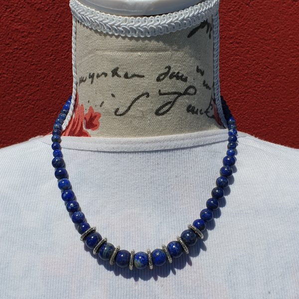 Fabriqué à la main dans notre atelier en Suisse, ce collier en pierres naturelles de lapis lazuli présente une couleur unique d’un bleu intense parsemée d’éclats jaunes. En lithothérapie*, le lapis lazuli symbolise la sagesse, l’intuition et l’amitié. Il apporterait courage et bonne humeur, et libèrerait des angoisses. Le lapis lazuli est associé au chakra du troisième œil et, bien qu’il ne soit incompatible avec aucun signe astrologique, il est particulièrement adapté pour les signes Sagittaire, Capricorne, Verseau, Poissons, Taureau, Vierge.