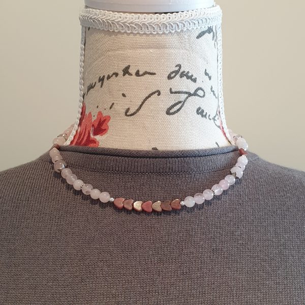 Fabriqué à la main dans notre atelier en Suisse, ce collier associe le rose très clair du quartz rose, et le rose soutenu de la rhodonite. En lithothérapie*, le quartz rose symbolise l’amour, la paix, et l’acceptation alors que la rhodonite symbolise la paix, la tranquillité d’esprit, et le pardon. Elles sont toutes les deux associées aux chakras du cœur.