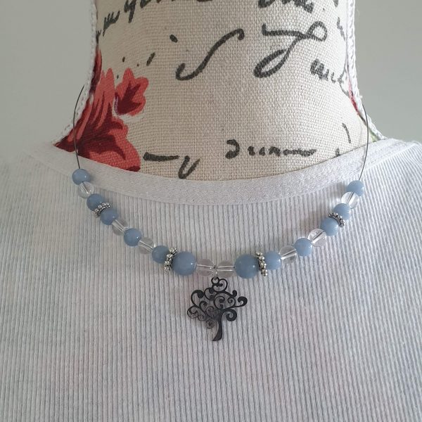 Fabriqué à la main dans notre atelier en Suisse, le demi-collier en pierres naturelles d’angélite offre une douce couleur bleu clair. En lithothérapie*, l’angélite symbolise la patience et l’acceptation. Elle apporterait le calme et la patience, aiderait à la communication et améliorerait la confiance en soi. L’angélite est associée au chakra de la gorge et, bien qu’elle ne soit incompatible avec aucun signe astrologique, elle est particulièrement adaptée pour le signe du Verseaux. N’hésitez pas à consulter le guide des tailles pour vous aider à choisir votre collier.