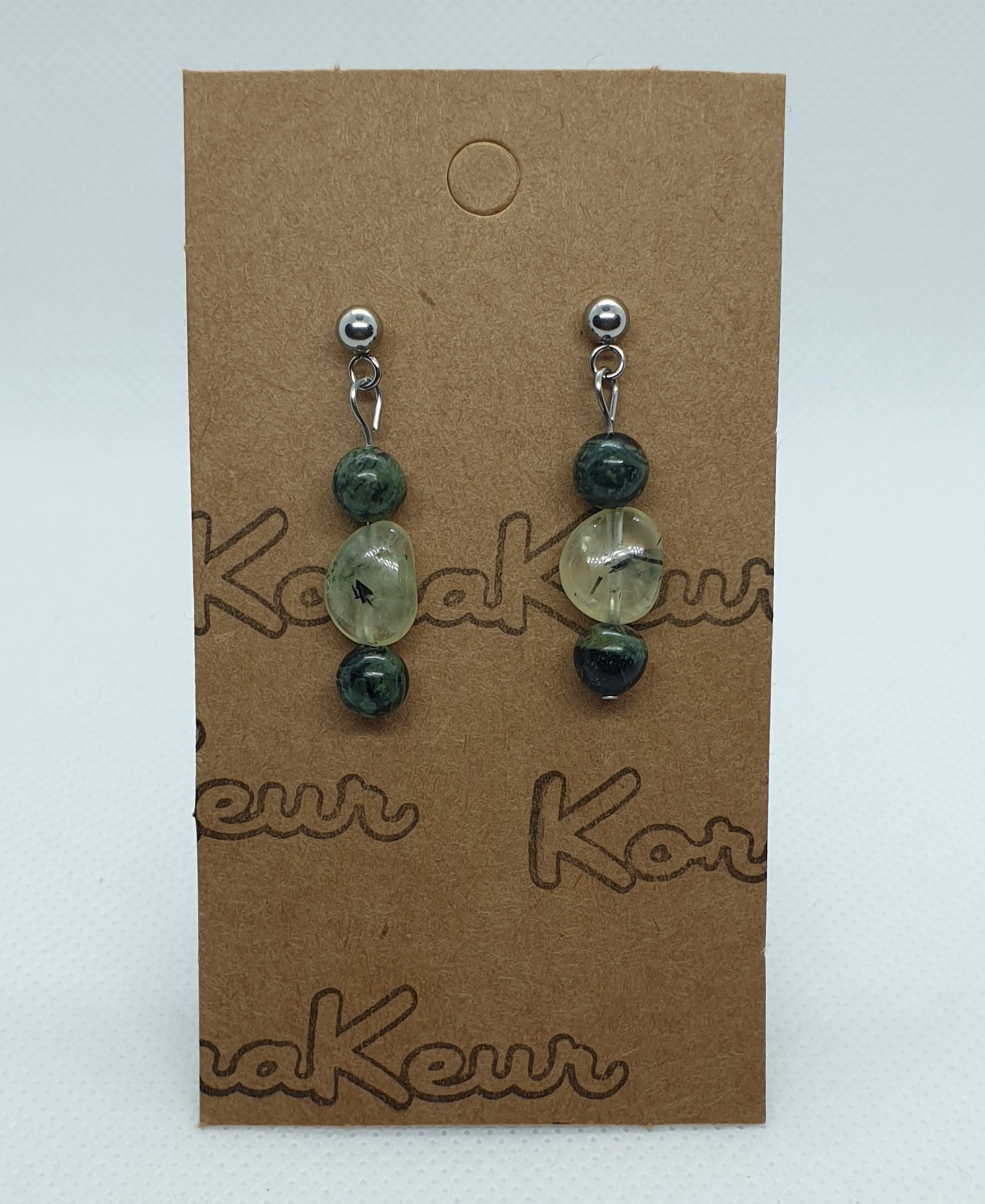 Fabriqués à a main dans notre atelier en Suisse, ces pendants d’oreilles en pierres naturelles aux tons de vert associent l’eldarite et la prehnite. En lithothérapie*, l’eldarite symbolise le soutien et l’équilibre. La prehnite quant à elle symbolise la confiance et le calme. Elles sont toutes les deux associées aux chakras du cœur.