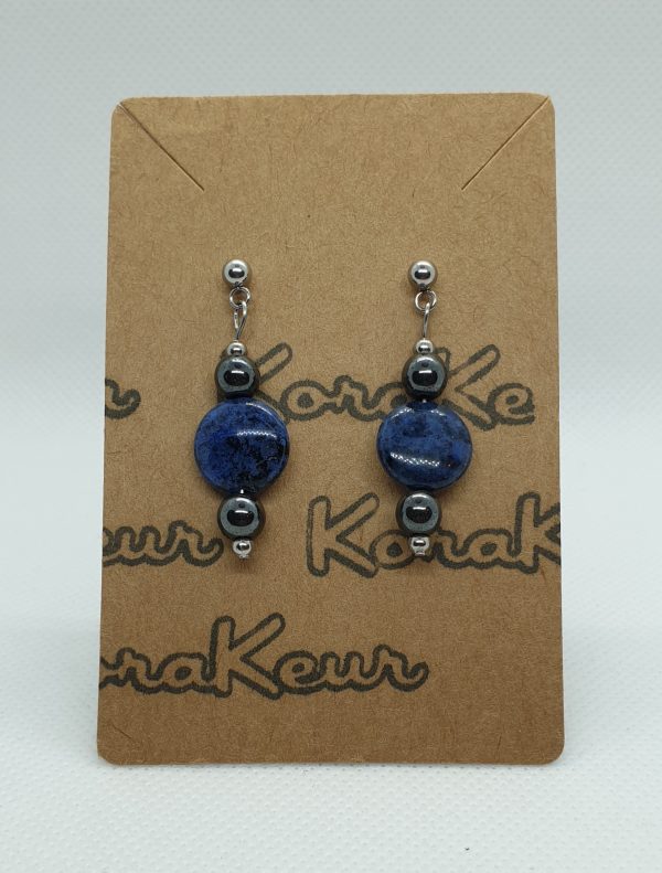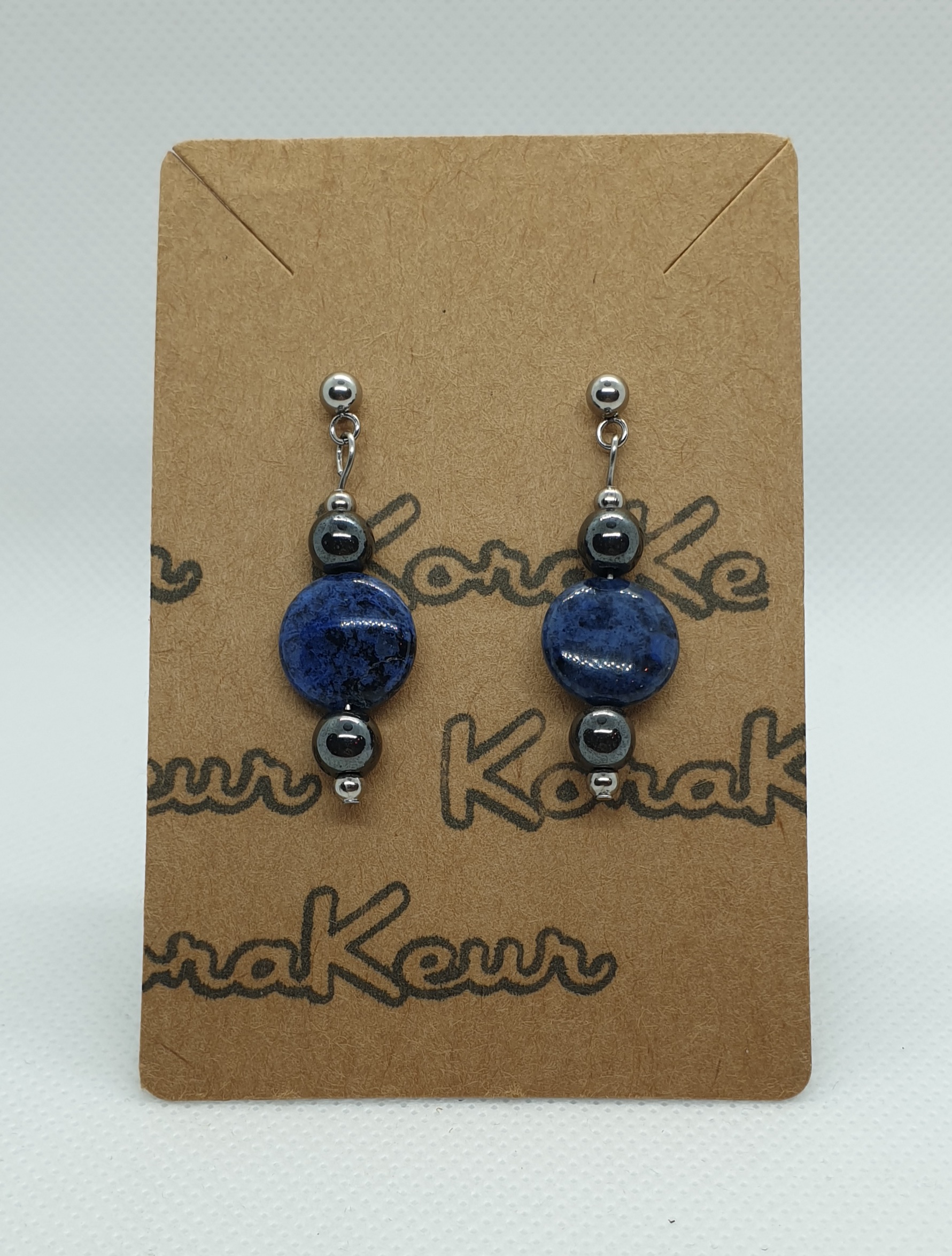 Fabriqués à la main dans notre atelier en Suisse, les pendants d’oreilles en pierres naturelles allient le gris métallique de l’hématite et le bleu sombre de la dumortiérite. En lithothérapie*, l’hématite symbolise l’ancrage et la stabilisation. La dumortiérite quant à elle symbolise l’apaisement et la légèreté.