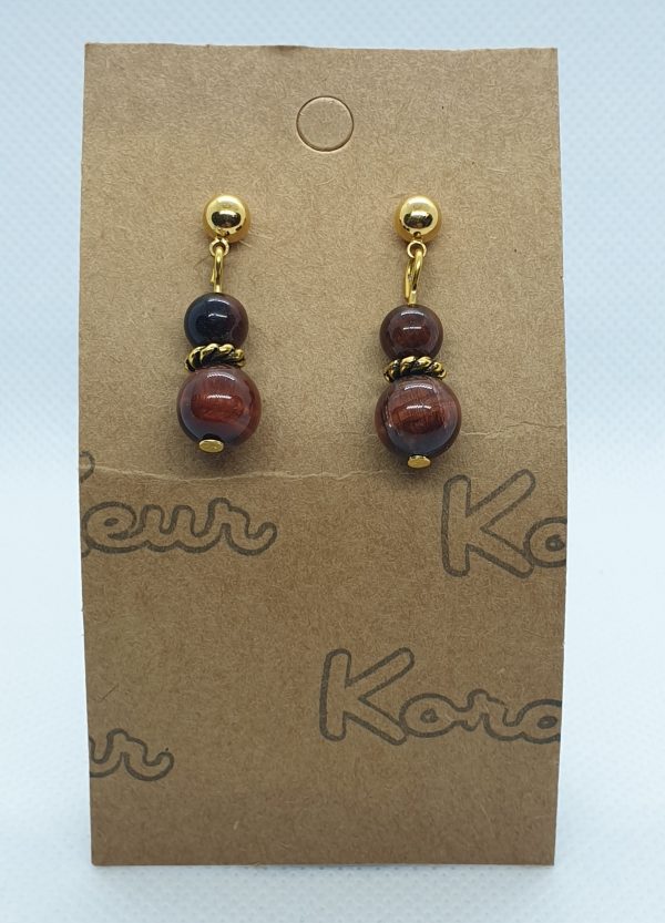 Fabriqués à la main dans notre atelier en Suisse, ces pendant d’oreilles sont en pierres naturelles d’œil-de-tigre fer. L’œil-de-tigre fer ou œil-de-taureau se forme à partir de la pierre Œil de tigre dont la couleur dorée et marron vire au rouge brun éclatant quand on la chauffe. En lithothérapie*, l’œil-de-tigre fer symbolise la persévérance, l’action et l’énergie. Il apporterait confiance en soi, force et motivation, et serait un anti-stress. L’œil-de-tigre fer est associé au chakra racine et, bien qu’il ne soit incompatible avec aucun signe astrologique, il est particulièrement adapté pour les signes Bélier, Taureau, Scorpion.